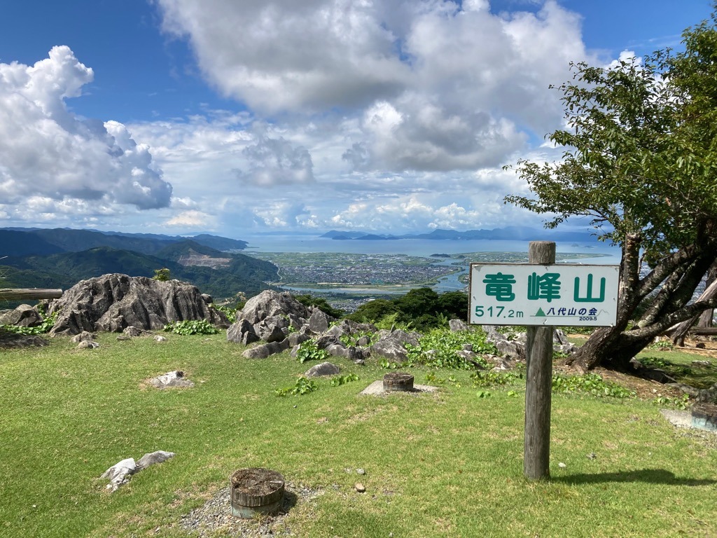 八代平野や八代海が一望できる、標高517mの龍峯山(りゅうほうざん)。5合目、8合目、山頂にはそれぞれ広場があり、5合目までは車で登れるよう駐車場やトイレも完備されています。市民の憩いの場や健康づくりの場としても親しまれ、登山道入口から頂上広場までは1時間半程度で登ることができます。